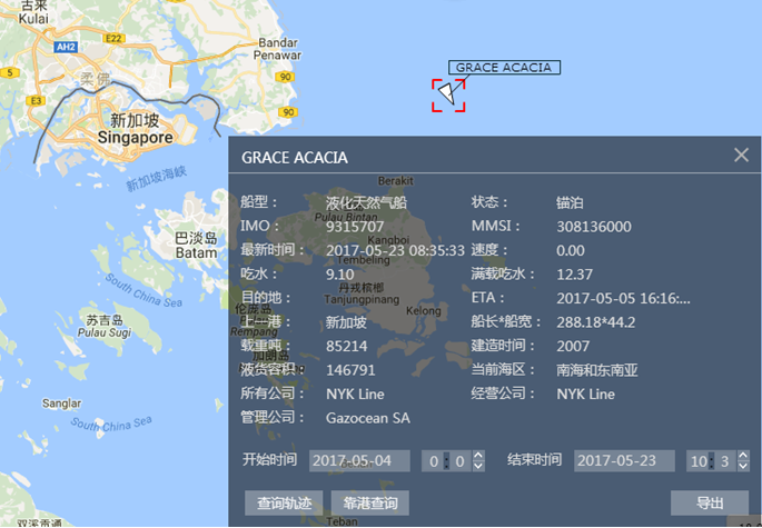 上述人士透露,广汇能源已经租用“GRACE ACACIA”轮作为这次LNG货的备用船舶。亿海蓝航运数据显示,该船自5月5日开始停止航行,一直在新加坡外锚地抛锚,截止5月23日,仍处于锚泊状态。该船液货容积14.6791万立方米,船东和经营公司都是日本邮船。亿海蓝旗下产品船讯网船舶资料显示,该公司总共拥有44艘LNG 运输船,当前在运营的LNG船队39艘。